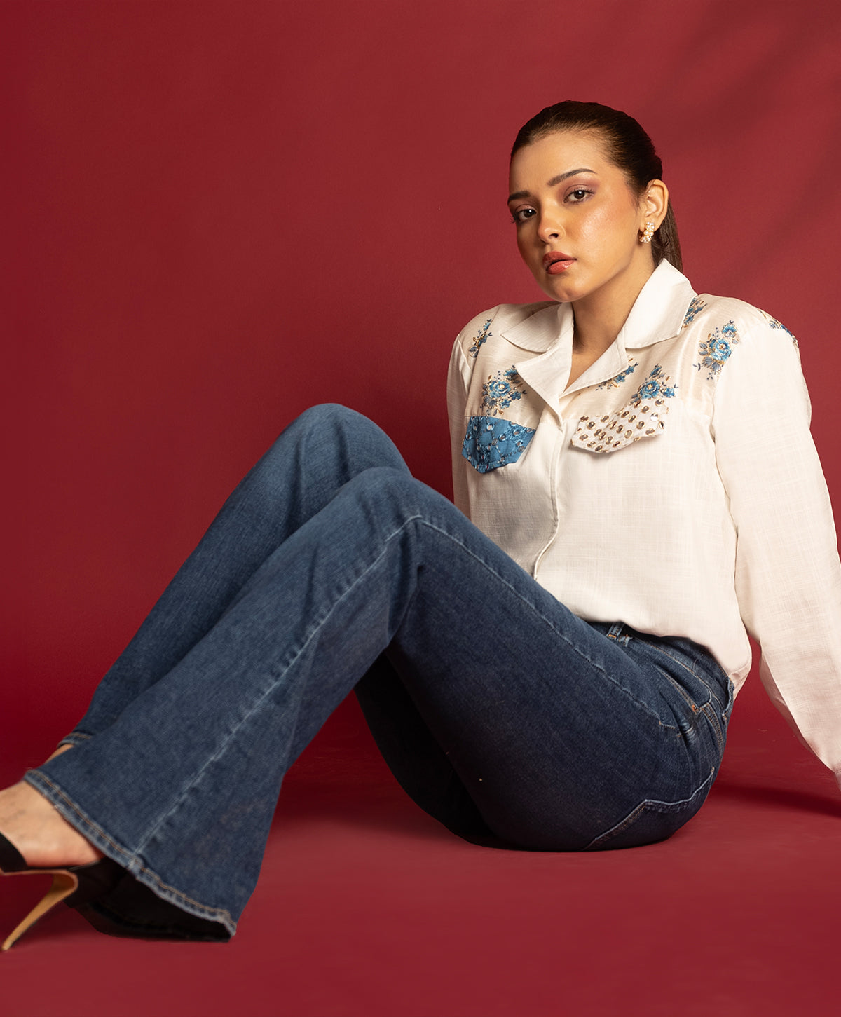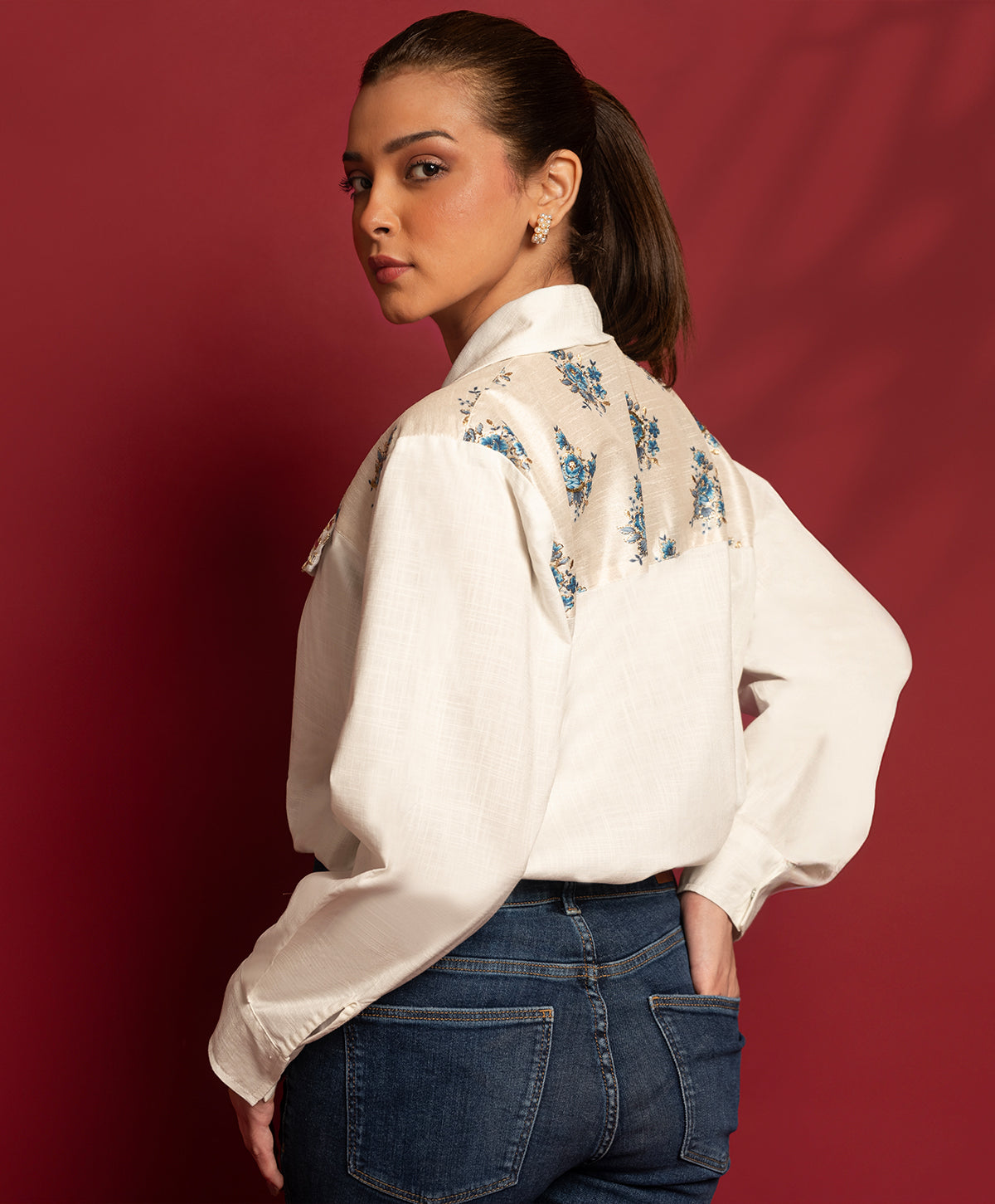This shirt combines Irish fabric with Indian detailing on the upper bodice. Adding a touch of sparkle, the pocket flap features sheesha detailing.