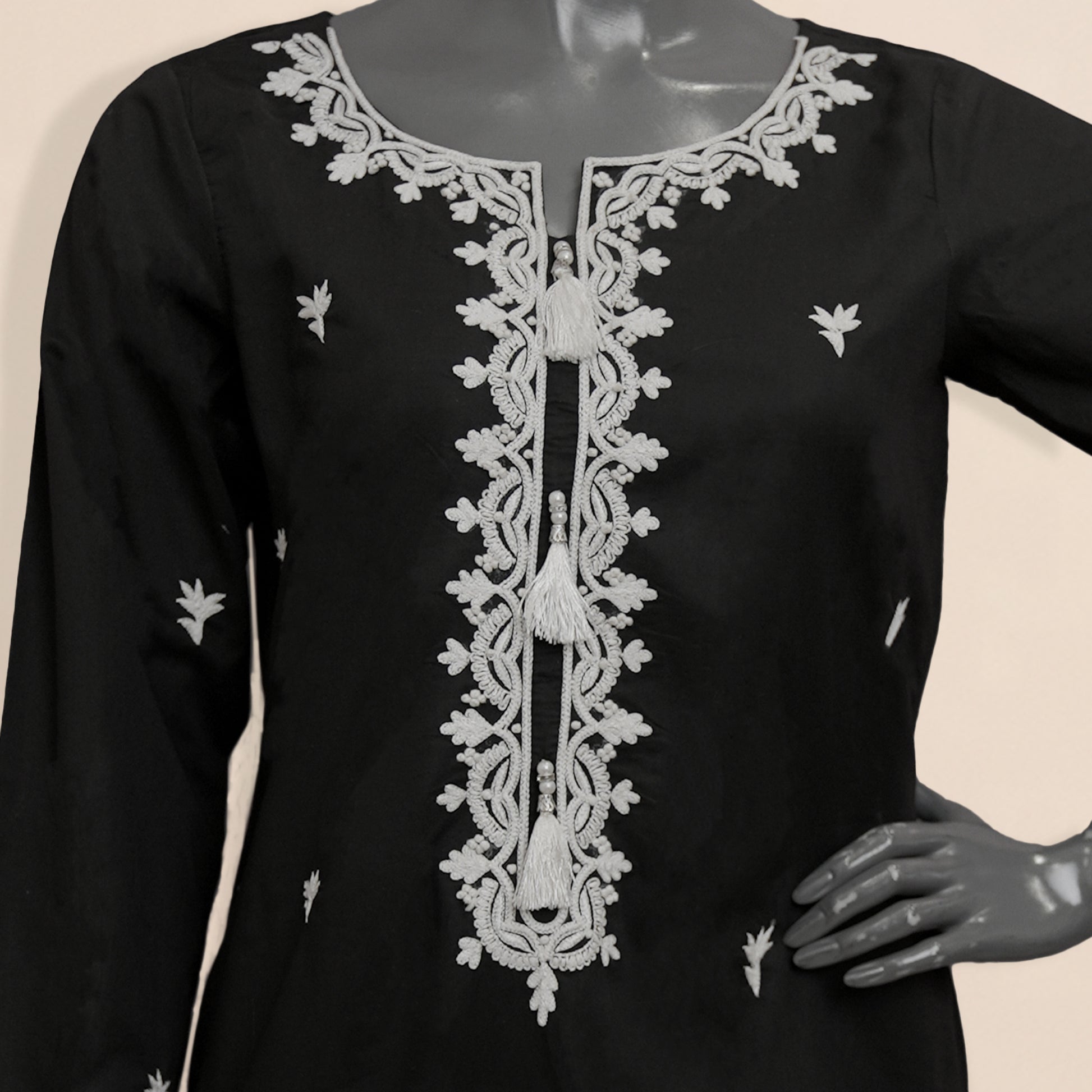 A black two-piece lawn suit with embroidered neckline along with resham buttons, followed by embroidery on the sleeves and borders of the shirt.