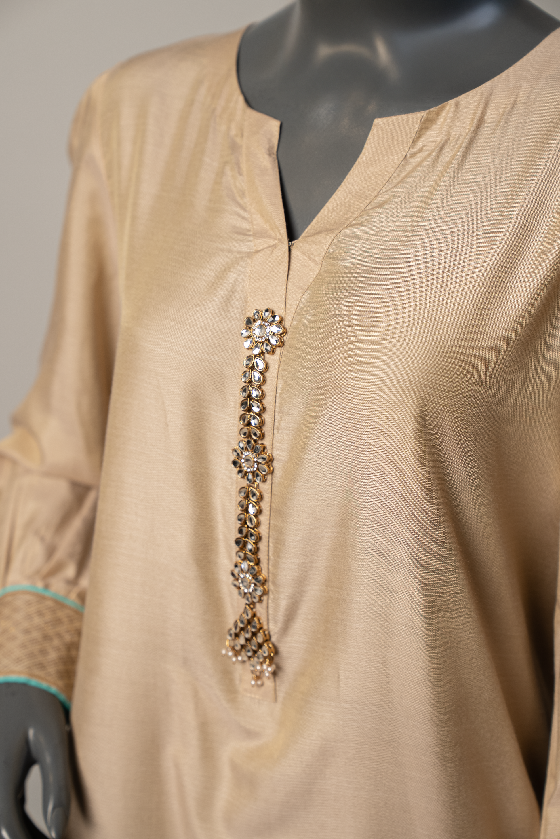 Elevate your festive look with this timeless beige ensemble, featuring delicate detailing and statement back tassels. Perfect for summer soirées and intimate gatherings. 💫