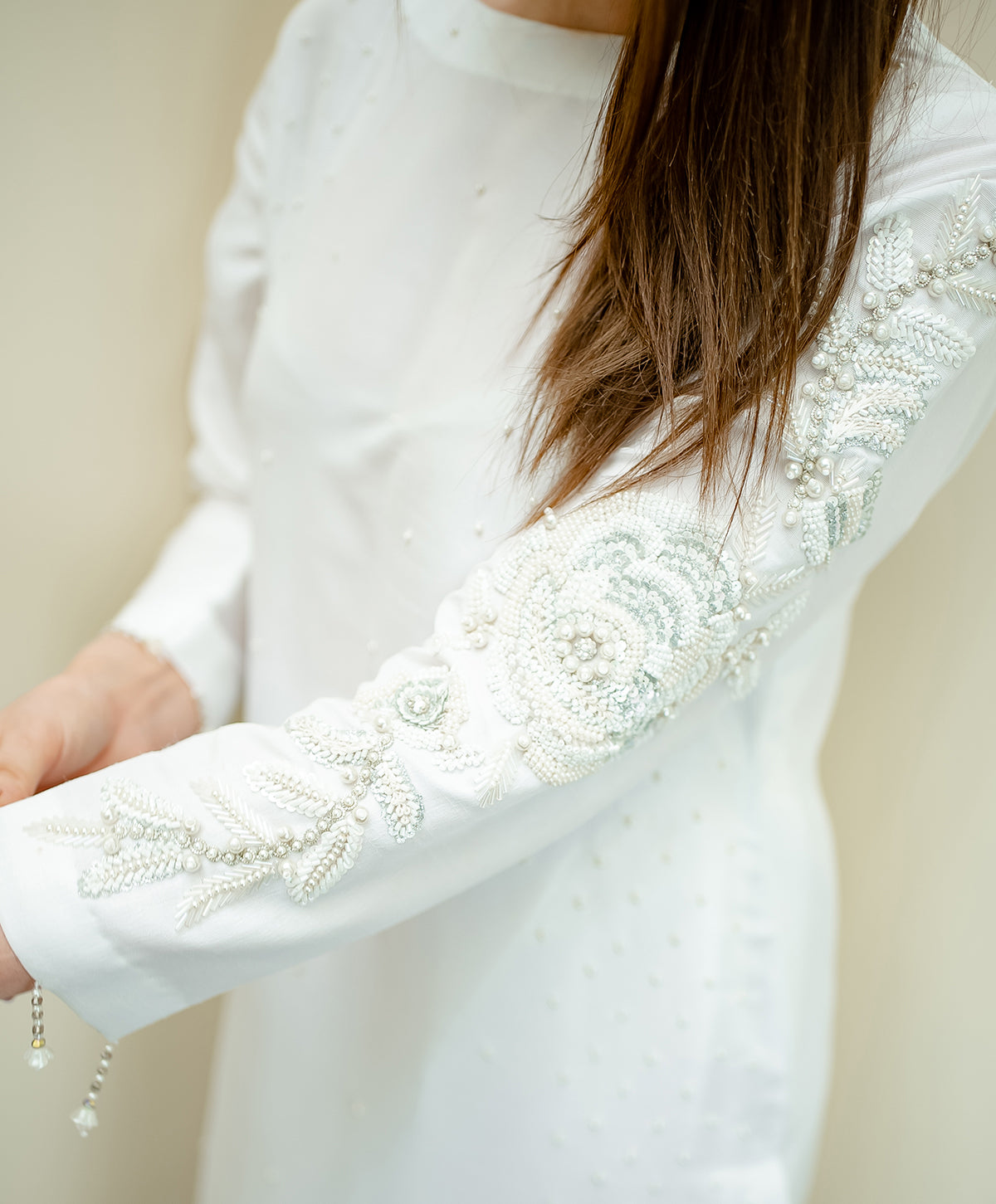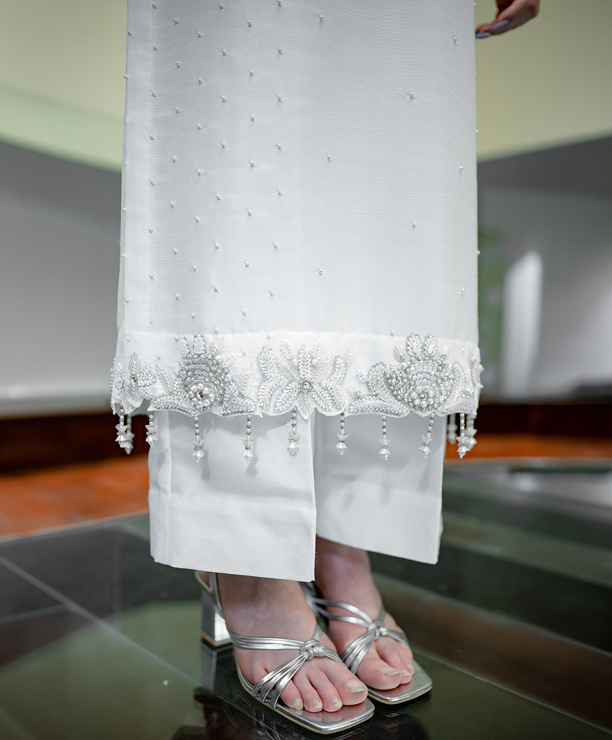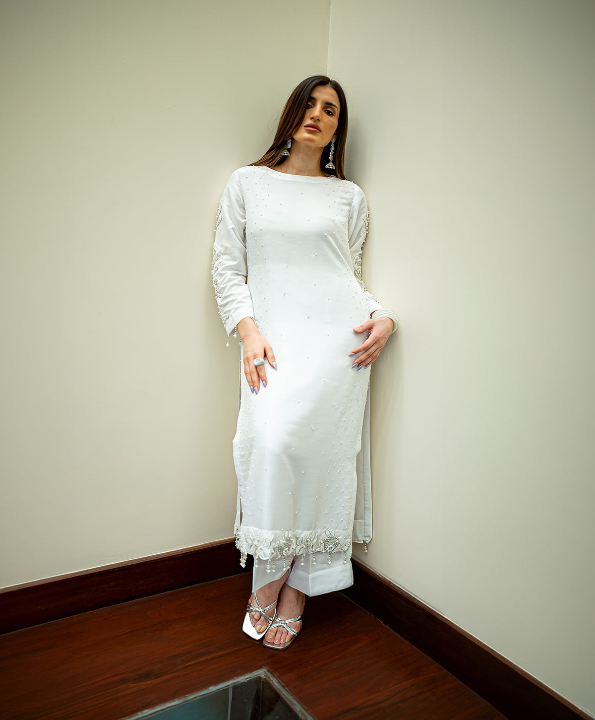 An elegant two piece, straight shirt and trouser made with white raw silk embedded with pearl beads over the shirt along with snowy hand embroidery and tassels hanging on the sleeves and bottom.