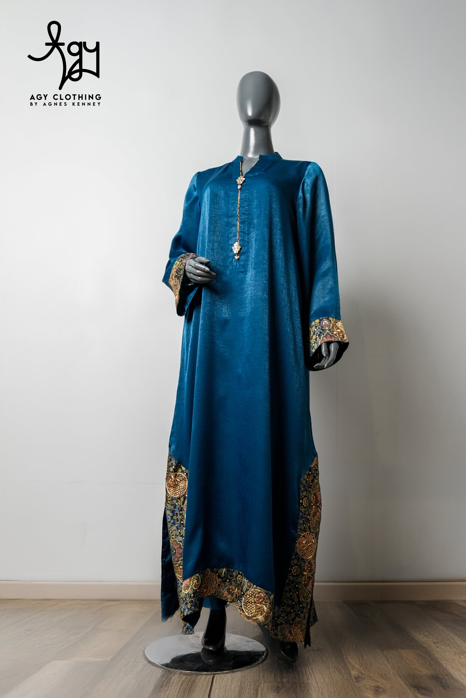 Step into regal elegance with The Sapphire Empress Kaftan from AGY Clothing by Agnes Kehney. This stunning garment is crafted from a luxurious, deep teal fabric with a subtle, shimmering texture that catches the light beautifully.