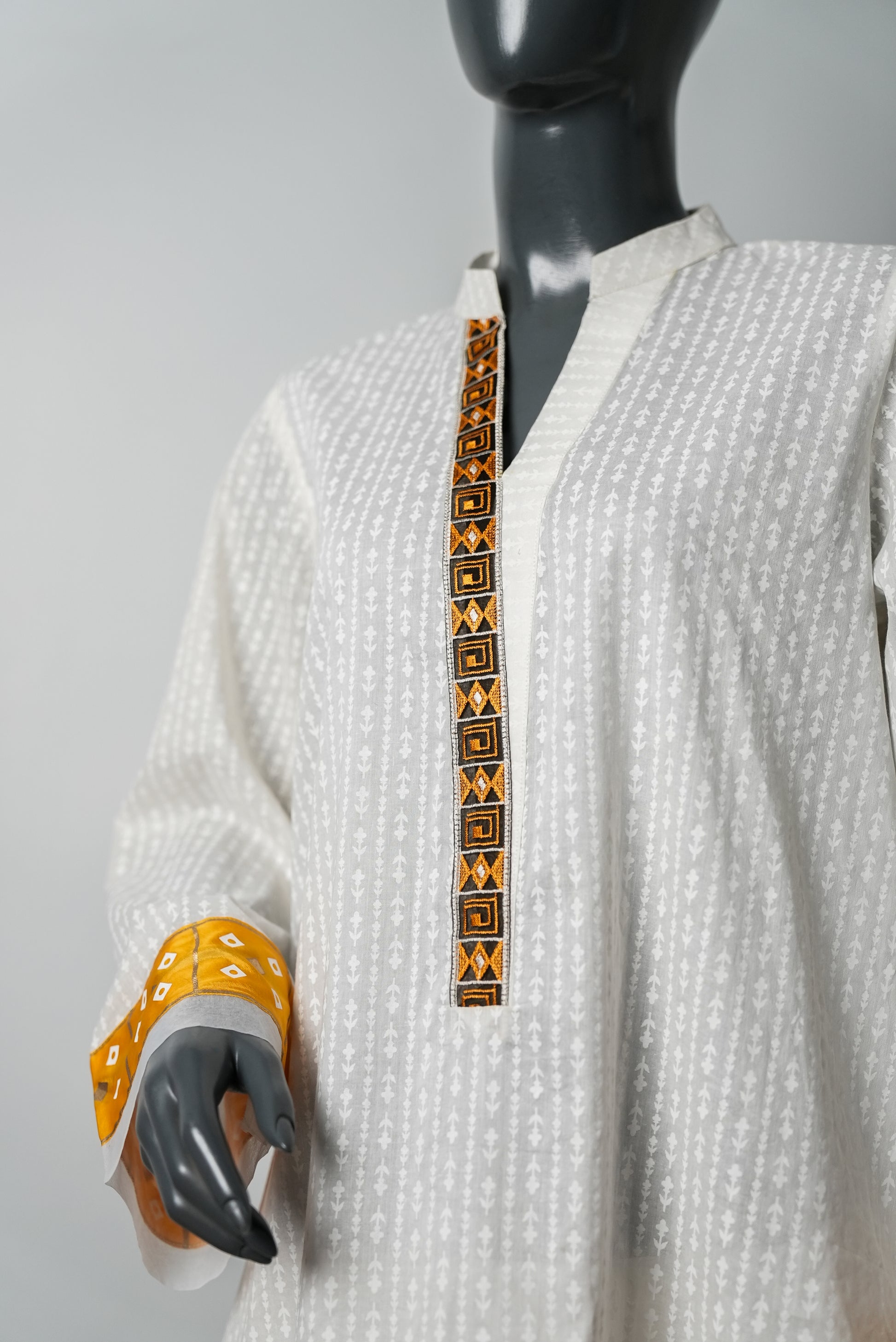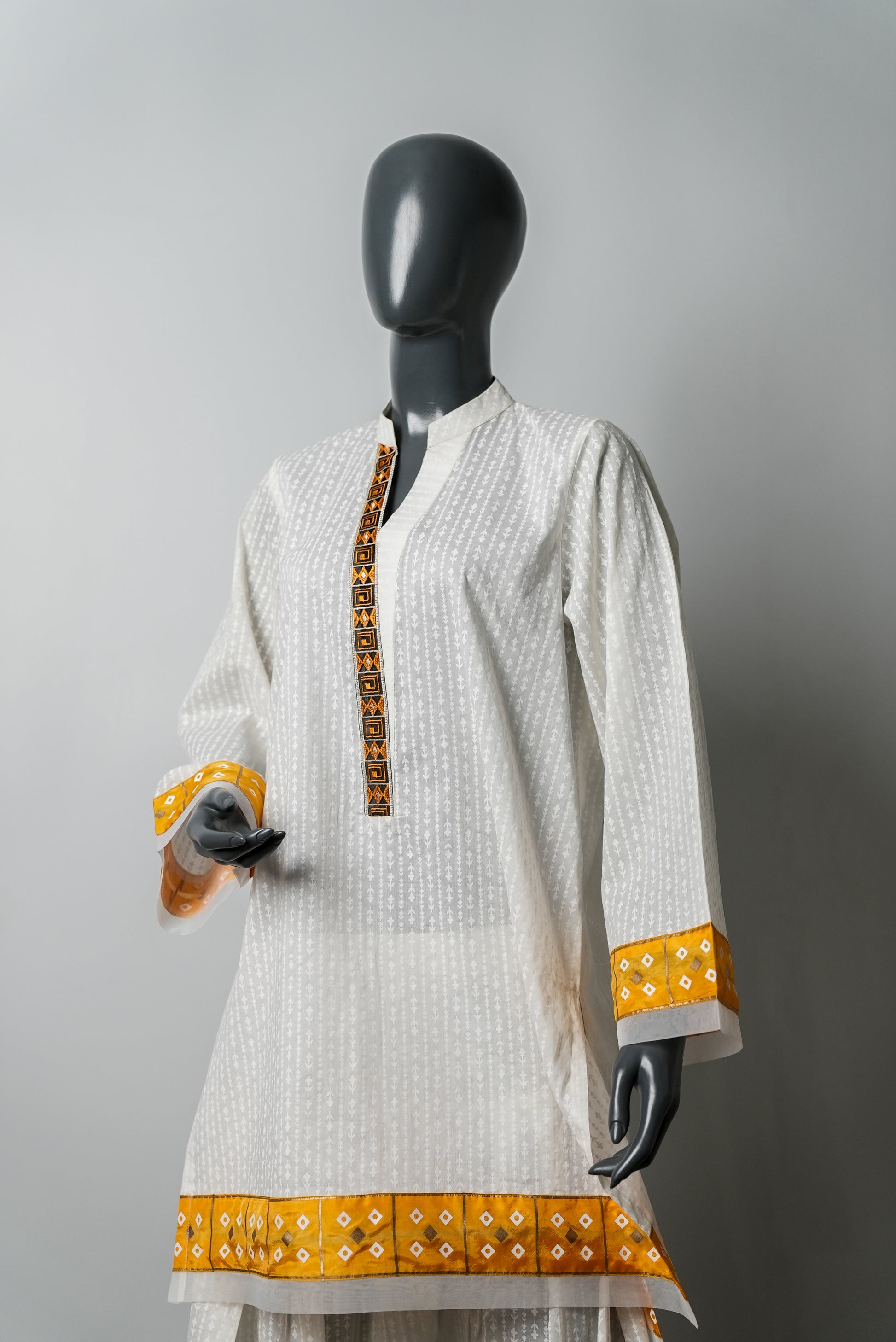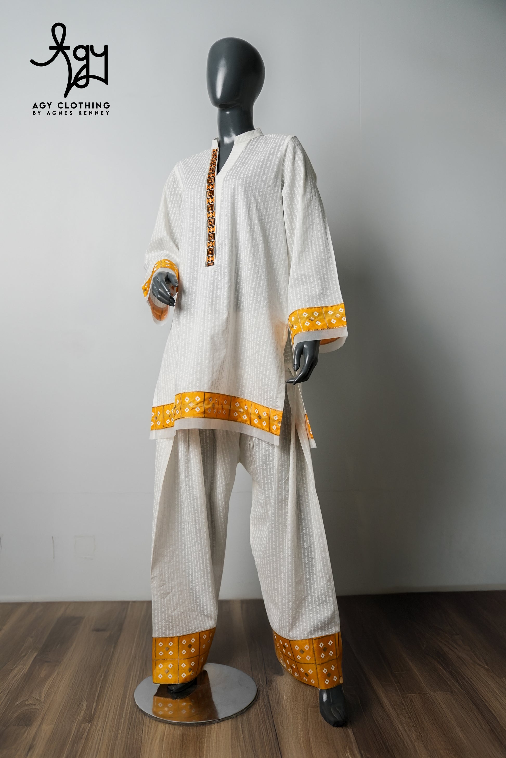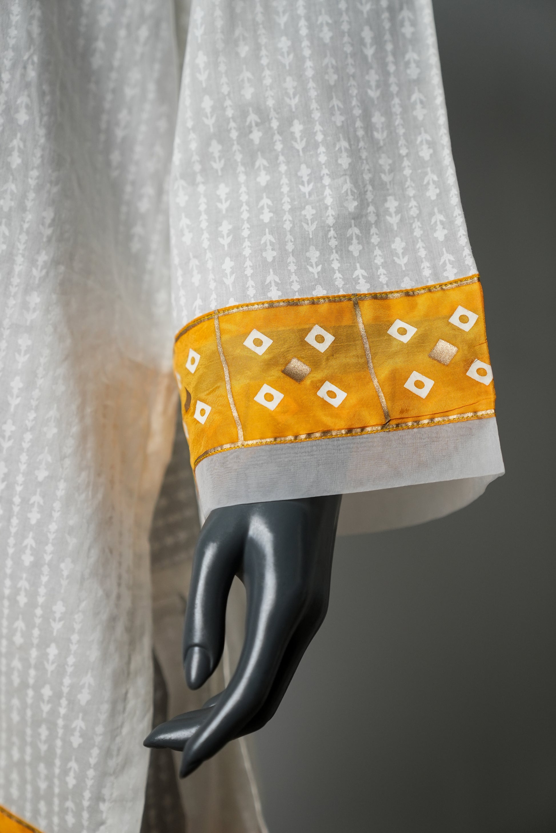 The ensemble features a comfortable white fabric with a subtle, self-patterned texture, offering a light and airy feel. The clean white base is beautifully contrasted with eye-catching marigold yellow and white printed accents, adding a touch of sunshine to your wardrobe.